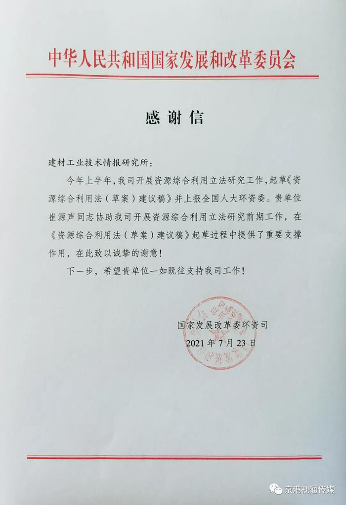7月23日,國家發(fā)展改革委環(huán)資司發(fā)來一封感謝信,信中對建筑工業(yè)技術(shù)情報研究所首席專家兼中國綠建進出口產(chǎn)業(yè)聯(lián)盟主席崔源聲同志在《資源綜合利用法(草案)建議稿》起草過程中做出的努力給予肯定并表示感謝。詳細內(nèi)容如下: